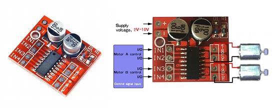 This controller is physically smaller than the L298N and can control less motor current, but it has essentially the same control pins, output terminals and control mechanism as the L298N, so can be considered a drop in replacement.